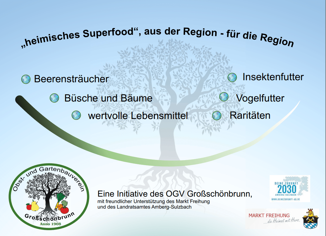 Nachdem der Obst- und Gartenbauverein (OGV) vor einigen Jahren für Kinder- und Jugendliche aus Klein- und Großschönbrunn im Vorgarten des ehemaligen Schulhauses in Großschönbrunn einen Blumen- und Naschgarten angelegt hatte, wurde nun ein „öffentlicher heimischer Superfoodgarten“ für Groß und Klein sowie Jung und Alt angelegt. Dazu ist geplant, in öffentlichen Flächen zunächst in Klein- und Großschönbrunn und bei entsprechender Nachfrage gerne in weiteren Ortsteilen der Marktgemeinde Freihung Beerenobst als heimisches „Superfood“ anzubauen, zu pflegen und zu ernten. Somit wird Groß- und Kleinschönbrunn zur „ess- und naschbaren“ Ortschaft der Marktgemeinde Freihung und des Landkreises Amberg-Sulzbach und leistet einen wertvollen Beitrag zur Biodiversität mit regionalen Beeren-Obstsorten. Gefördert wird das Bewusstsein zu unserem wertvollen heimischen Beerenobst, als regionalem „Superfood“ aus der Region für die Region, ohne dafür kostbare und unnötige Ressourcen zu verschwenden. Neben der Möglichkeit, wertvolle und teilweise in Vergessenheit geratene Beeren-Obstsorten für die Öffentlichkeit zum Naschen und Probieren zur Verfügung zu stellen, sollen gemeinschaftliche Information- und Arbeitsaktionen angeboten werden, um diese richtig zu pflanzen, zu pflegen, gemeinsam zu ernten und auf verschiedene Arten zu verwerten. Der Obst- und Gartenbauverein ist überzeugt, hierdurch wertvolles Wissen unserer Vorfahren wieder aufzubauen und die Geschmäcker neu zu erleben. Das Projekt wird mit 800 EUR aus der Förderrichtlinie Leitbild gefördert.