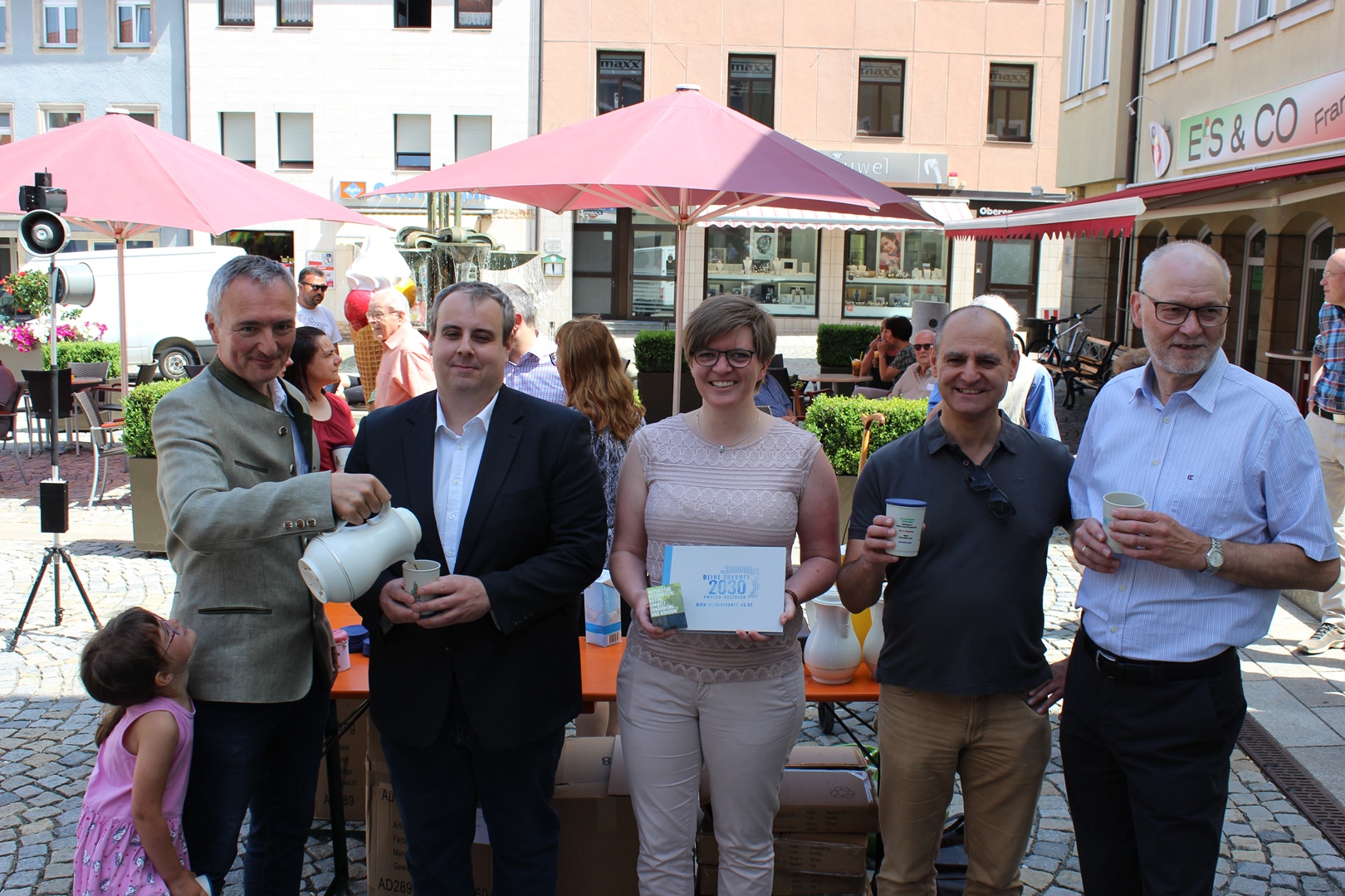 Am 15. Juni 2019 konnten die beschafften Becher an die teilnehmendne Betriebe ausgegeben werden. Zur Übergabe war Maria Regensburger vom Landkreis Amberg-Sulzbach in Auerbach und informierte die Anwesenden über das Konzept des Leitbilds sowie der Förderrichtlinie. Anschließend nahmen die teilnehmen Betriebe die Becher von Dr. Harald Schwartz (MdL, Vorsitzender CSU-Kreisverband Amberg-Sulzbach), Bernhard Hinteregger (Vorsitzender CSU Auerbach), Maria Regensburger (Ansprechpartnerin beim Landkreis Amberg-Sulzbach), Uwe Ditz (Vorsitzender CSU-Stadtratsfraktion Auerbach) und Klaus Riede (Geschäftsführer CSU Auerbach) in Empfang. Insgesamt elf Betreiber ließen sich von dem Konzept der Auerbecher überzeugen und werden diese künftig in ihren Geschäften ausgeben.