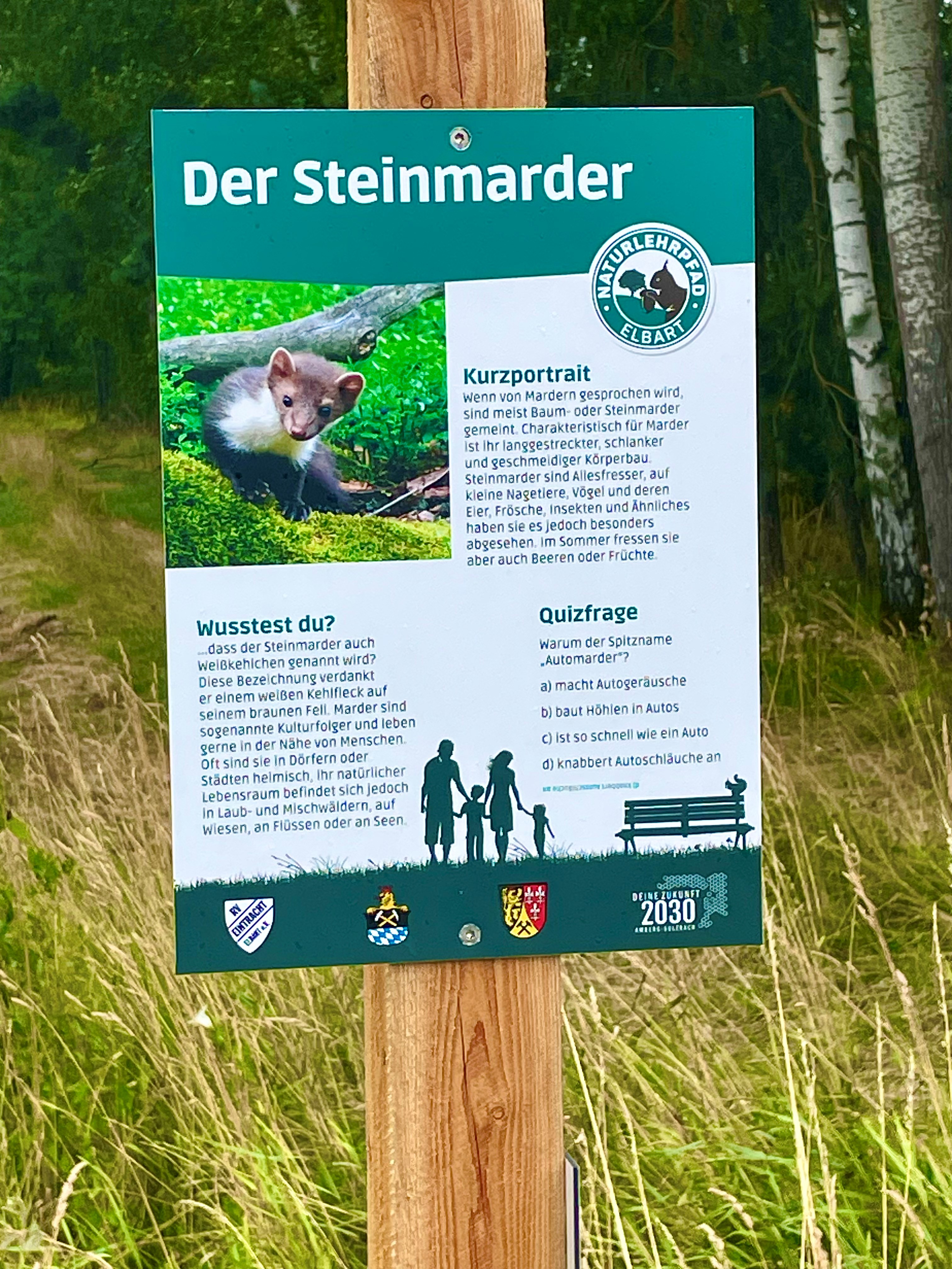 20 Info-Schilder informieren anschaulich über heimische Tiere und Pflanzen. Ein „Kurzportrait“ zeigt Wissenswertes auf, unter „Wusstest Du?“